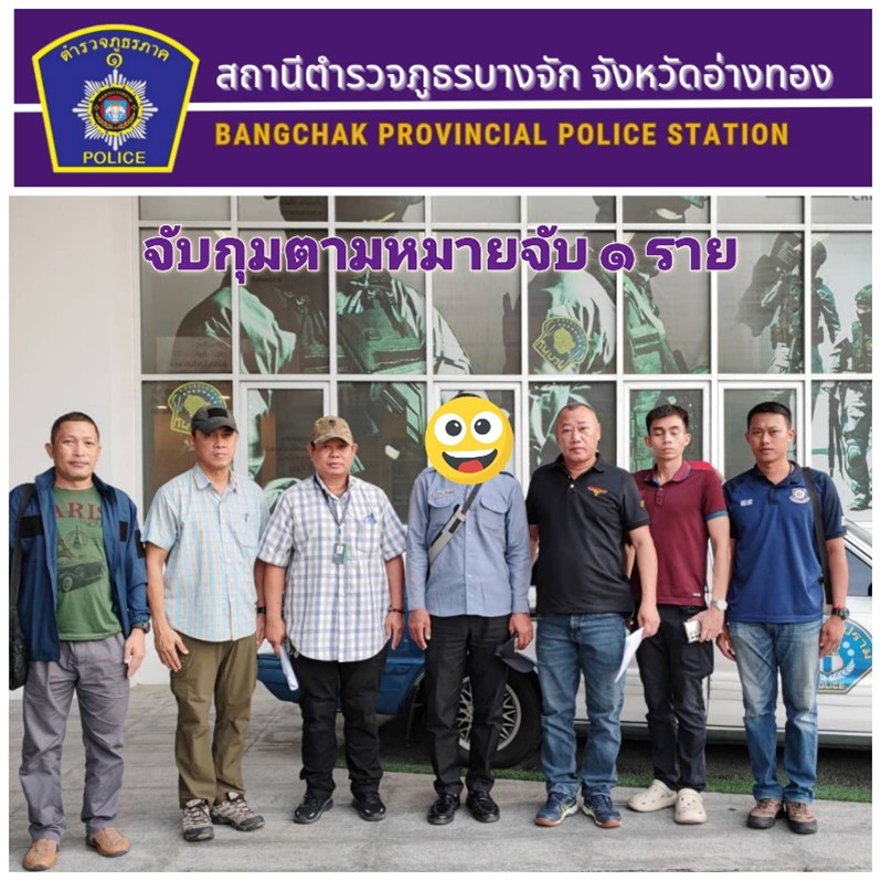 ได้ร่วมกันทำการจับกุมตามหมายจับศาลจังหวัดอ่างทองที่ ๙๑/๒๕๖๒ ลง ๓๐ พ.ค. ๒๕๖๒ ซึ่งต้องหาว่า “วิ่งราวทรัพย์ “