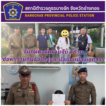 ได้ร่วมกันทำการจับกุมตัว ตามหมายจับศาลจังหวัดสมุทรปราการ ที่ ๖๐๒/๒๕๖๔ ลง ๑๐ กรกฎาคม ๒๕๖๗ ซึ่งต้องหาว่ากระทำความผิดฐาน “ร่วมกันฉ้อโกง และร่วมกันปลอมและใช้เอกสารสิทธิปลอม “