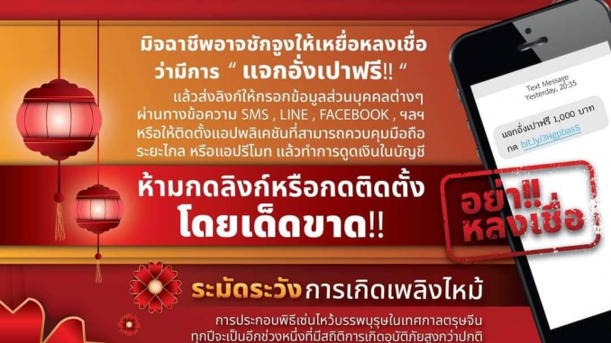 พ.ต.ท.หญิง ณพวรรณฯ กล่าวว่า ในช่วงวันที่ 20-22 มกราคม 2566 จะเป็นช่วงเทศกาลวันตรุษจีน ซึ่งเป็นวันขึ้นปีใหม่ของคนไทยเชื้อสายจีนและปัจจุบันกลุ่มโจรออนไลน์มักจะอาศัยจังหวะตามเทศกาลต่างๆ ฉวยโอกาสหลอกลวงประชาชน โดยในช่วงเทศกาลตรุษจีนนี้ มิจฉาชีพอาจชักจูงให้เหยื่อหลงเชื่อว่ามีการ “แจกอั่งเปาฟรี” แล้วส่งลิงก์เพื่อให้เรากรอกข้อมูลส่วนบุคคลต่างๆ หรืออาจจะหลอกให้ติดตั้งแอปพลิเคชันที่สามารถควบคุมมือถือระยะไกล หรือ แอปรีโมท แล้วทำการดูดเงินในบัญชี หากเราได้รับ SMS ในลักษณะดังกล่าวห้ามกดลิงก์โดยเด็ดขาด รวมถึงไม่กรอกข้อมูลส่วนตัวใดๆ กรณีมีข้อความเลขรหัสเข้าเครื่องโทรศัพท์ไม่ทราบที่มาที่ไป ห้ามเผยแพร่บุคคลอื่นทราบ หากเผลอกดลิงก์ติดตั้งแอปฯ แปลกปลอมดังกล่าว ให้รีบลบหรือรีเซต เครื่องใหม่ทันที หากโทรศัพท์ไม่ค้างหรือดับ วิธีที่ตัดทุกอย่างคือ “เปิดโหมดเครื่องบิน” หากเครื่องค้างให้ กดปุ่มเปิด-ปิดแช่ไว้ เป็นการตัดสัญญาณโทรศัพท์เครือข่ายอินเทอร์เน็ตทันที